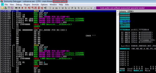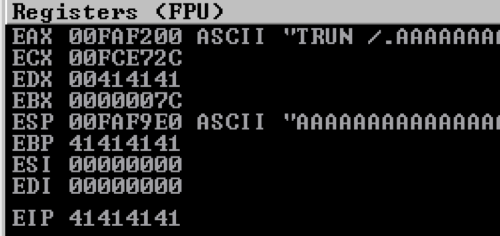 Looking at the debugger, which is now paused, we can see that there are a few registers that have the A (0x41) characters in them. Specifically, the EIP (Extended Instruction Pointer) register, which would allow us to directly control execution flow during the buffer overflow.