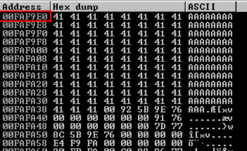 Right-clicking on the ESP (Stack Pointer) register value and then ‘Follow in Dump’ shows the virtual memory address and the values that are currently stored in memory. This is our numerous amount of A characters that we sent, which is now inserted in to the stack.