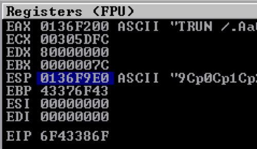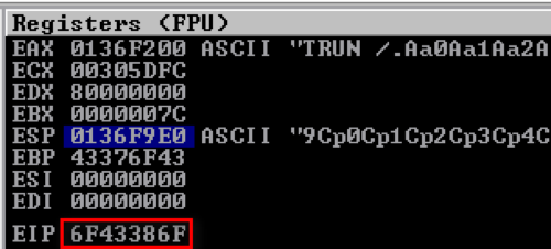 After sending the offset string, we can see that the debugger has paused again and the EIP register contains a hex string. To the upper-right there’s an excerpt of the unique string pattern that is sent, which is being stored in ESP.