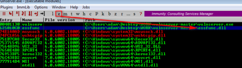 As the 'essfunc.dll' library comes packaged as a requirement to run the vulnserver program we can look in there. Click the ‘Executable Modules’ icon and then double-click on the ’essfunc.dll’ library. This loads the view of the module within the debugger.