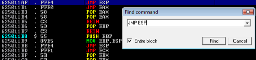 The type of commands that we’re looking to find are JMP ESP, CALL ESP, or possibly PUSH ESP, RET. This will execute an instruction to jump to the memory address in the ESP register and then execute the instruction here (i.e. EIP, which is where we’ll place the shellcode).