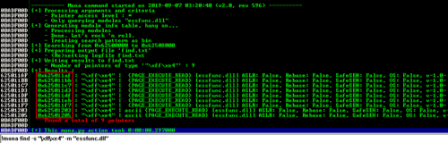 Mona can be used to automate this with the command !mona find -s "\xff\xe4" -m "essfunc.dll" (using the opcodes for JMP ESP) or !mona jmp -r esp -m "essfunc.dll" for the instructions directly. The output of Mona is useful to identify any protections that may be in place (ASLR, etc.)