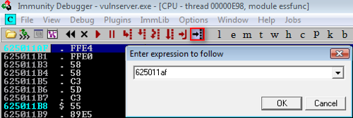 To get a clear understanding of what is happening, we’ll step through the execution flow of the exploit in action. To do this, click the ‘Go To Expression’ icon and enter the address of the JMP ESP address that we identified earlier. Set a breakpoint by pressing the F2 key when highlighting the address, which will stop the execution flow at this point.