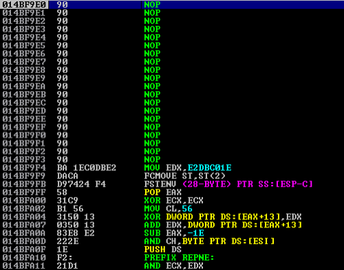 Next, press F7 once (or the step-into icon) and your execution flow will arrive at the initial NOP that was set following our jmp variable in the Python script.