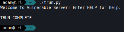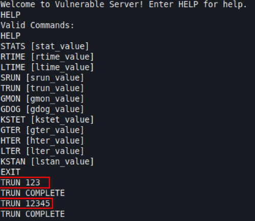 Insert some trailing arguments after the TRUN command and we’ll see the response is 'TRUN COMPLETE'. The inputs are highlighted in red below: