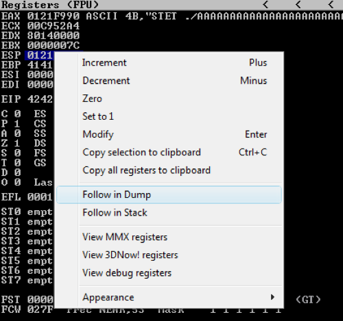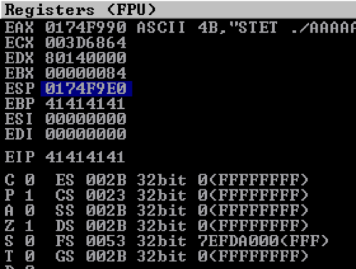 Similar to a basic overflow, we now know that the KSTET command is vulnerable to a buffer overflow. The next step is to identify the EIP offset, which is the point at which the instruction pointer (EIP) is overwritten by our input buffer.
