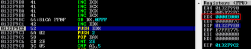 The EDX register is incremented by 1 each time, and the EDI register is set to the current memory address being checked.