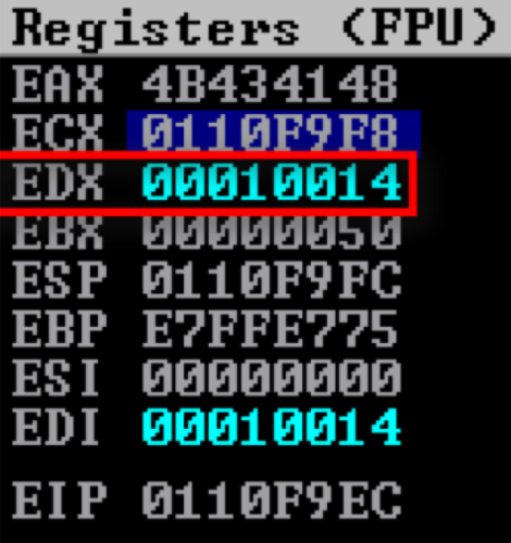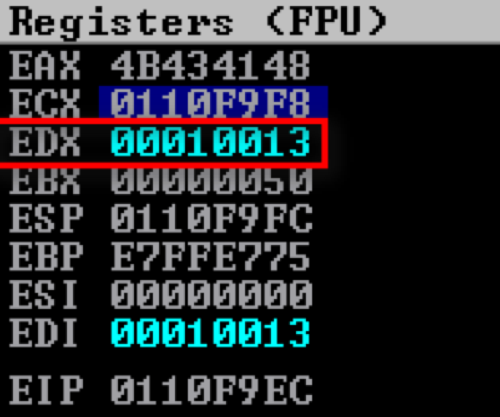 Stepping through increases the EDX register by 1. This will continue until the first instance of the "HACK" string is found, which is then stored in the EDI register. The egghunter will then continue to look for the second instance of the egg string, which is "HACK" again.