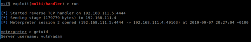 After letting execution continue we successfully receive a full (staged) Meterpreter shell, which we can then interact with using the Metasploit console.