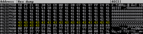 Here we can see that there is only 20 bytes of available space for our shellcode (marked by the 0x43 characters).