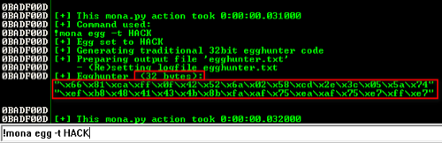 There are numerous ways to create an egghunter, such as with Mona using the !mona egg -t HACK command, using Matt Miller’s egghunter program, or even the Metasploit msf-egghunter tool (or by writing your own!).