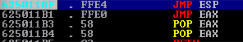This will return a list of valid JMP ESP instructions, which we can then use to overwrite the EIP register with. In this case, I’ll use the \xaf\x11\x50\x62 instruction, referencing the memory address 0x625011af.