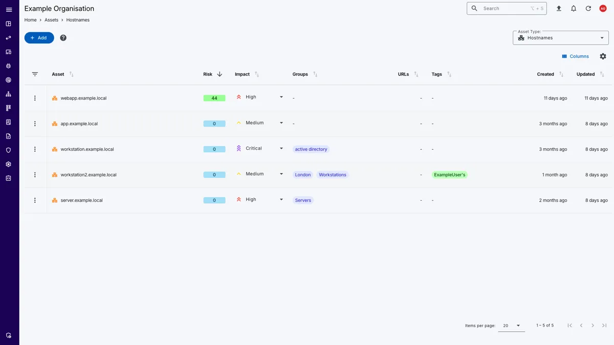 The Assets page provides a view of all assets across your organisation. You can filter and sort assets by various criteria, such as type, group, and risk score, to easily identify high-value assets and potential risks.