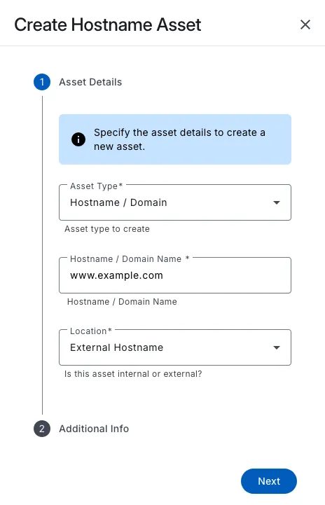You can easily select the type of asset you want to create, such as a hostname, domain, or IP address.