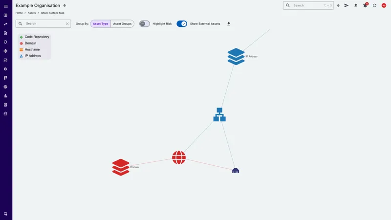 Interactive visualisation of your attack surface to understand the relationships between assets, services, and risk.